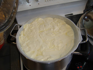 Don’t stir for the last 5 minutes so the curds can settle and you can drain the whey off. Line a stainless steel strainer or colander with a cheese cloth and drain the curds. Keep the curds in the strainer and reserve enough whey to fill the pot 1/3 full. Set the strainer over top of the whey in the pot and cover. Keep the whey in the pot at the same temperature mentioned above for 1 hour. If you prefer a moister cheese, you can reduce the time from the 1 hour to 45 minutes or even 30 minutes.