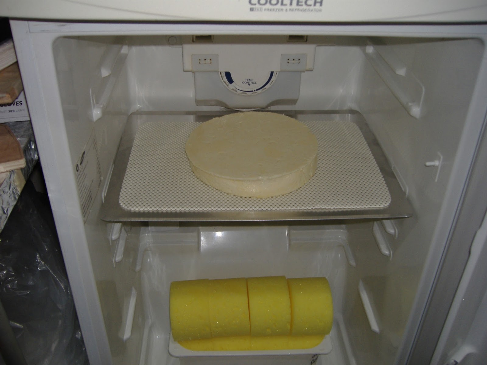| My cheese cave - an old fridge, temp controlled with high humidity provided by the sponges sprayed with water every few days. |