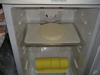 | Cheese straight out of the press, note there's still a little more whey to drain off. |