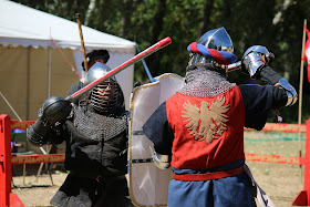 Shield: 15th Century reproduction of a footmans pavise based on a similar piece held by the rusthammer museum in Germany, I have altered construction a little for SCA combat the brackets on the back are aluminium for weight reduction and are a little longer and thicker for increased durability. The paint finish is clear coated and is based on my heraldic colours with my precedence of fealty starting at the bottom leading upwards. The shield is designed to be used center grip but also has straps for war scenarios.